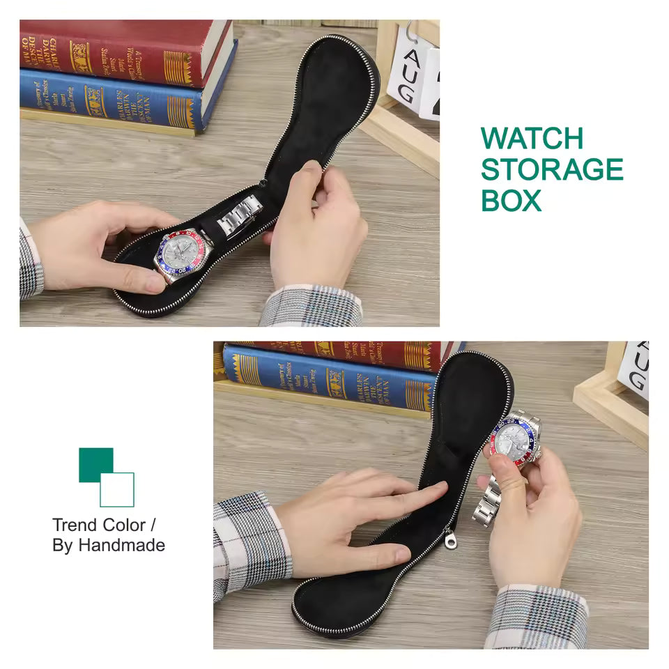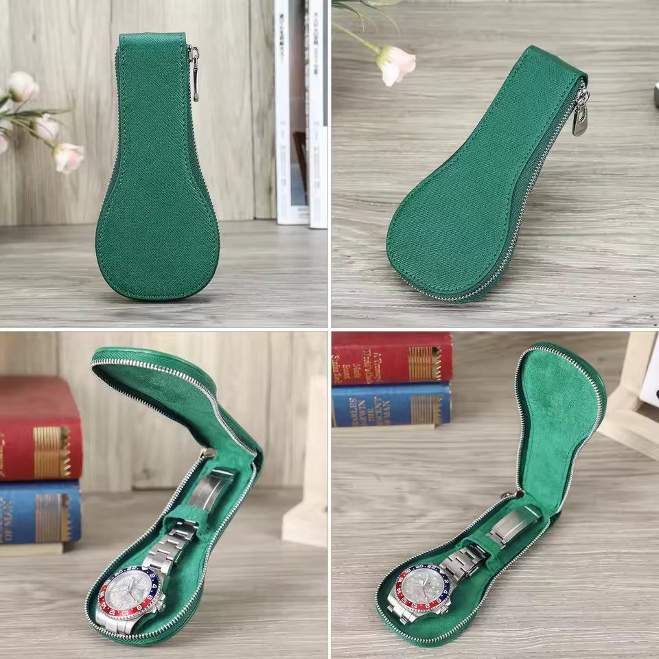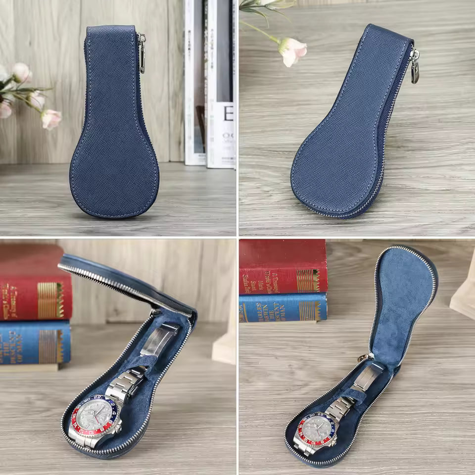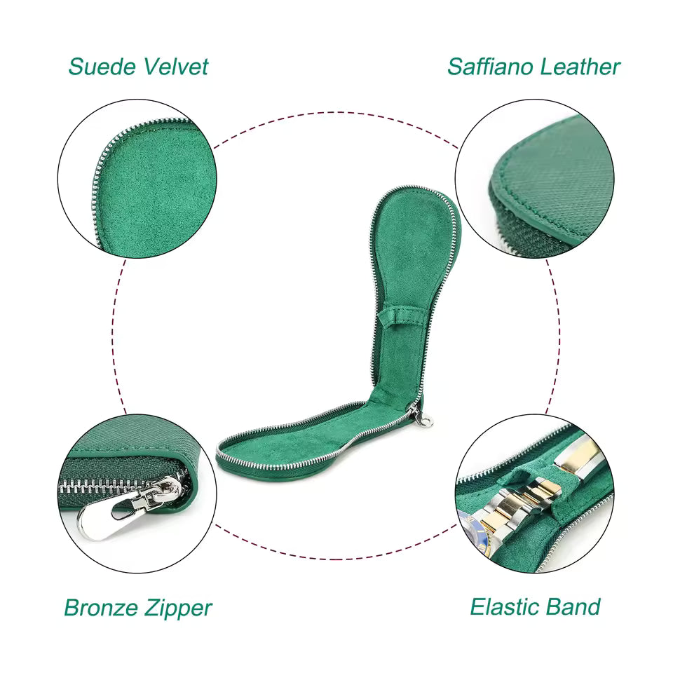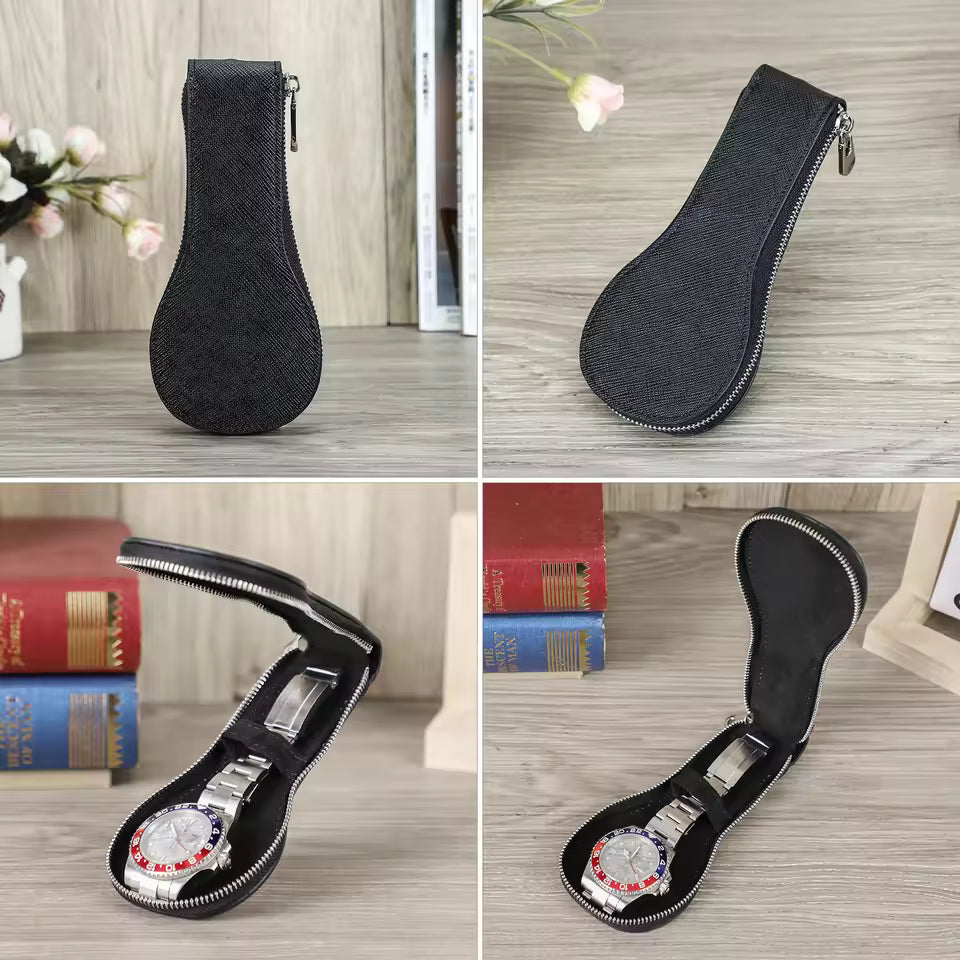 Genuine Saffiano Leather Single Slot Watch Case with Zipper - Portable Travel Watch Organizer