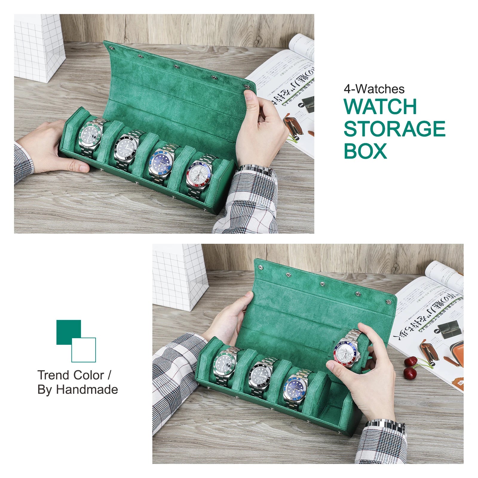 Genuine Leather 4-Slot Watch Travel Case - Portable Green Zipper Watch Box Organizer for Watches and Bracelets